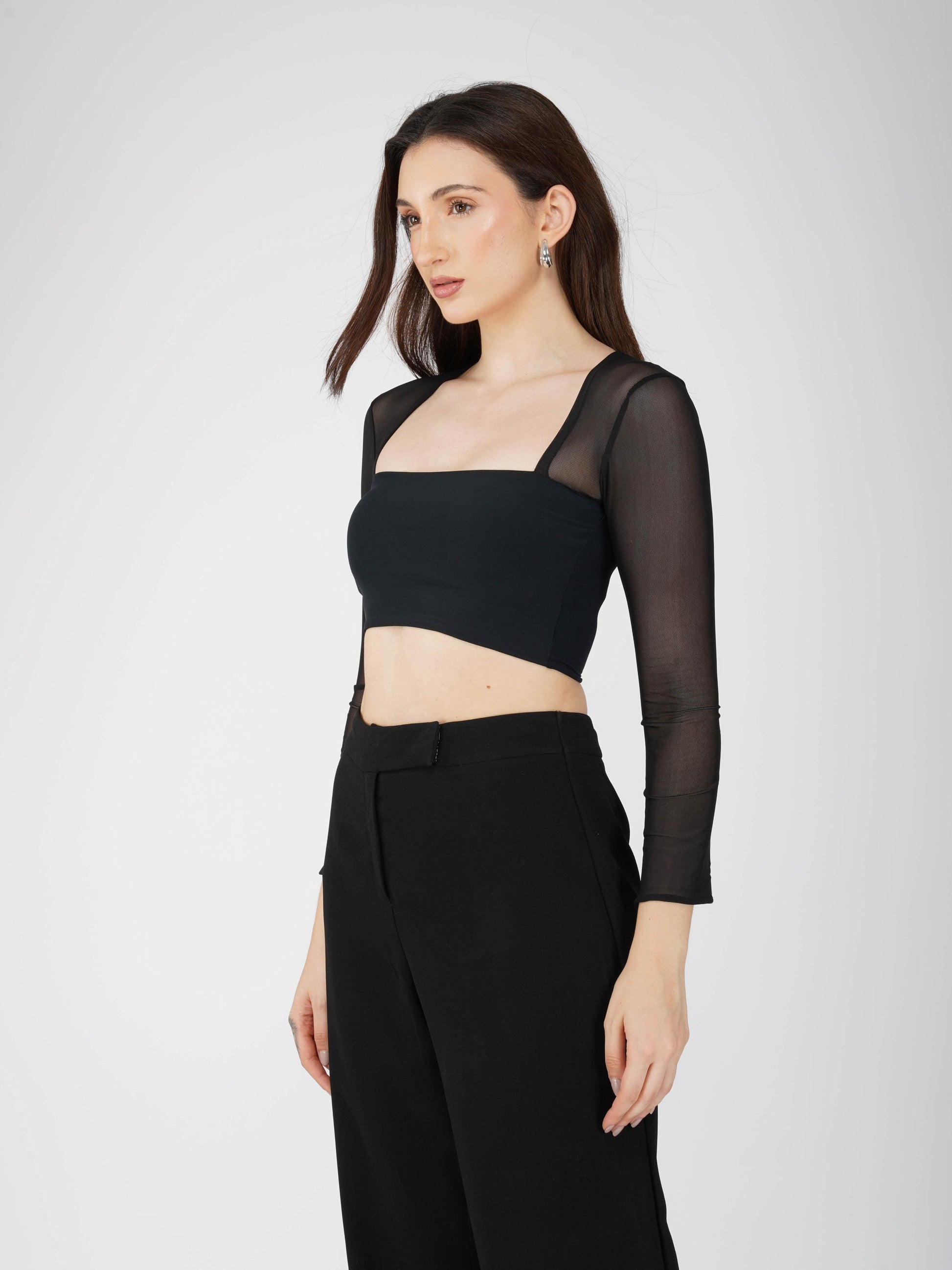 Elevate your basics with the Amber Top in Onyx. This chic black square neck crop top features delicate sheer sleeves and neckline, adding a touch of elegance to your everyday style. Perfect for layering or styling solo, it flatters with its fitted silhouette and versatile neutral hue. A must-have crop top for day-to-night looks.