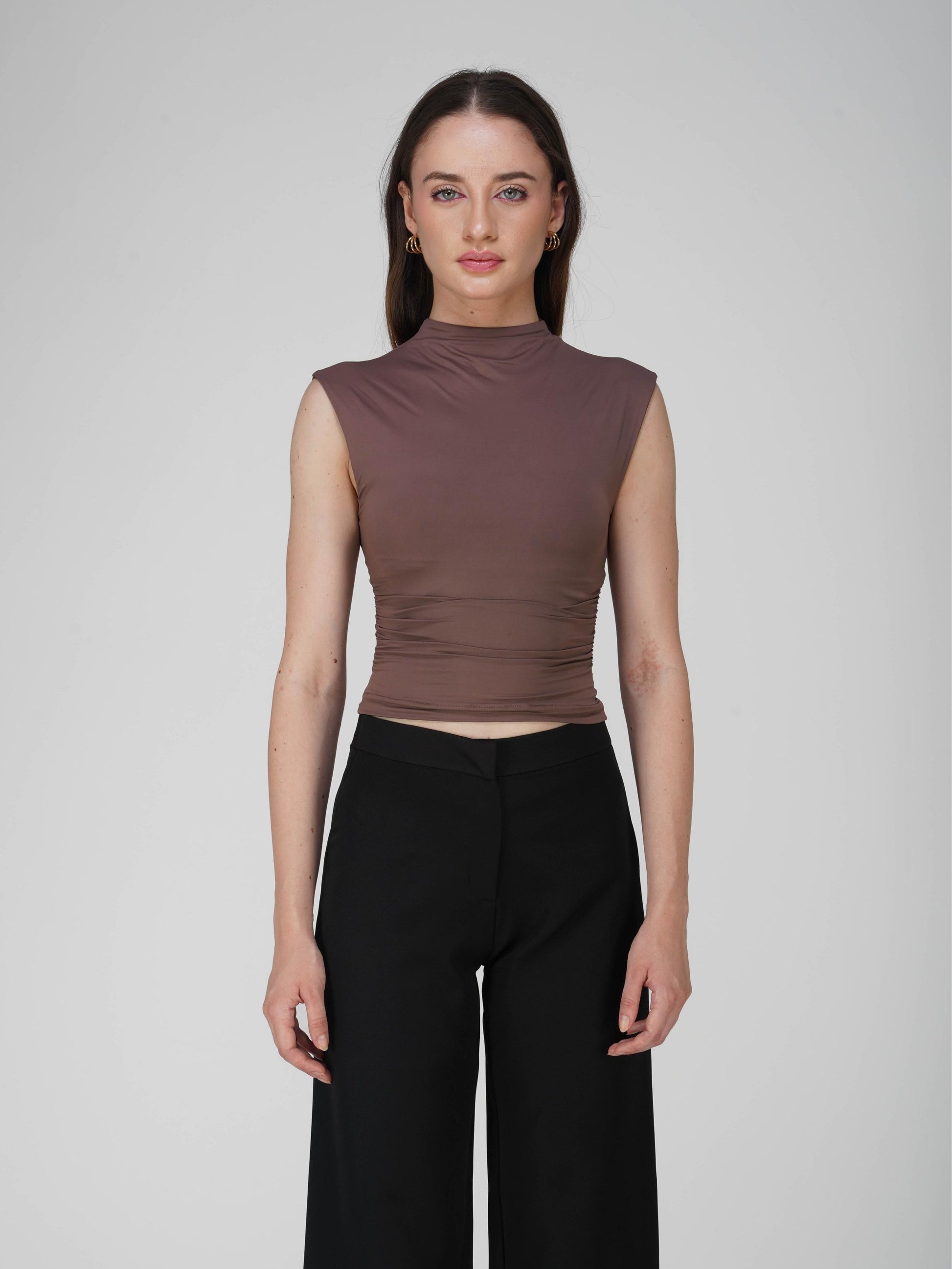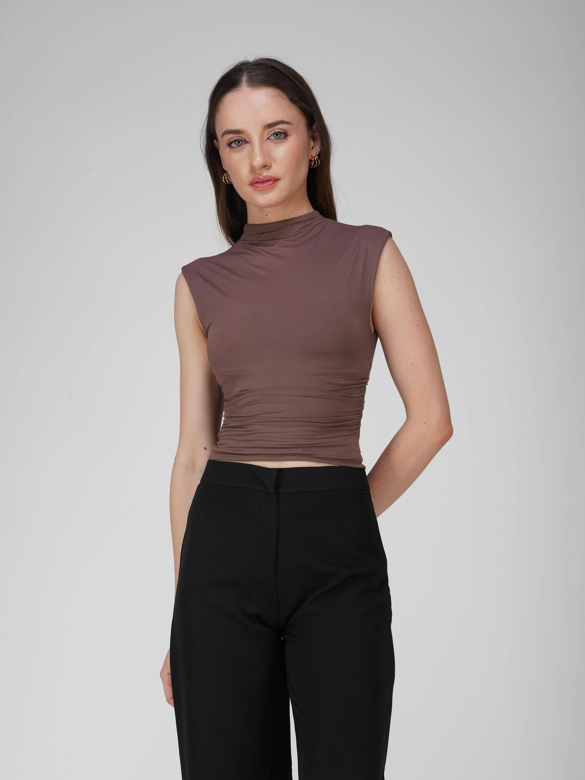 Refresh your wardrobe with the Beam Tee in Coco. This collared yoke top in rich coco brown features side ruched detailing for a snatched, sculpted look. With its sleek fit and polished collar, it’s perfect for pairing with high-waisted bottoms for an effortlessly cool day-to-night vibe.