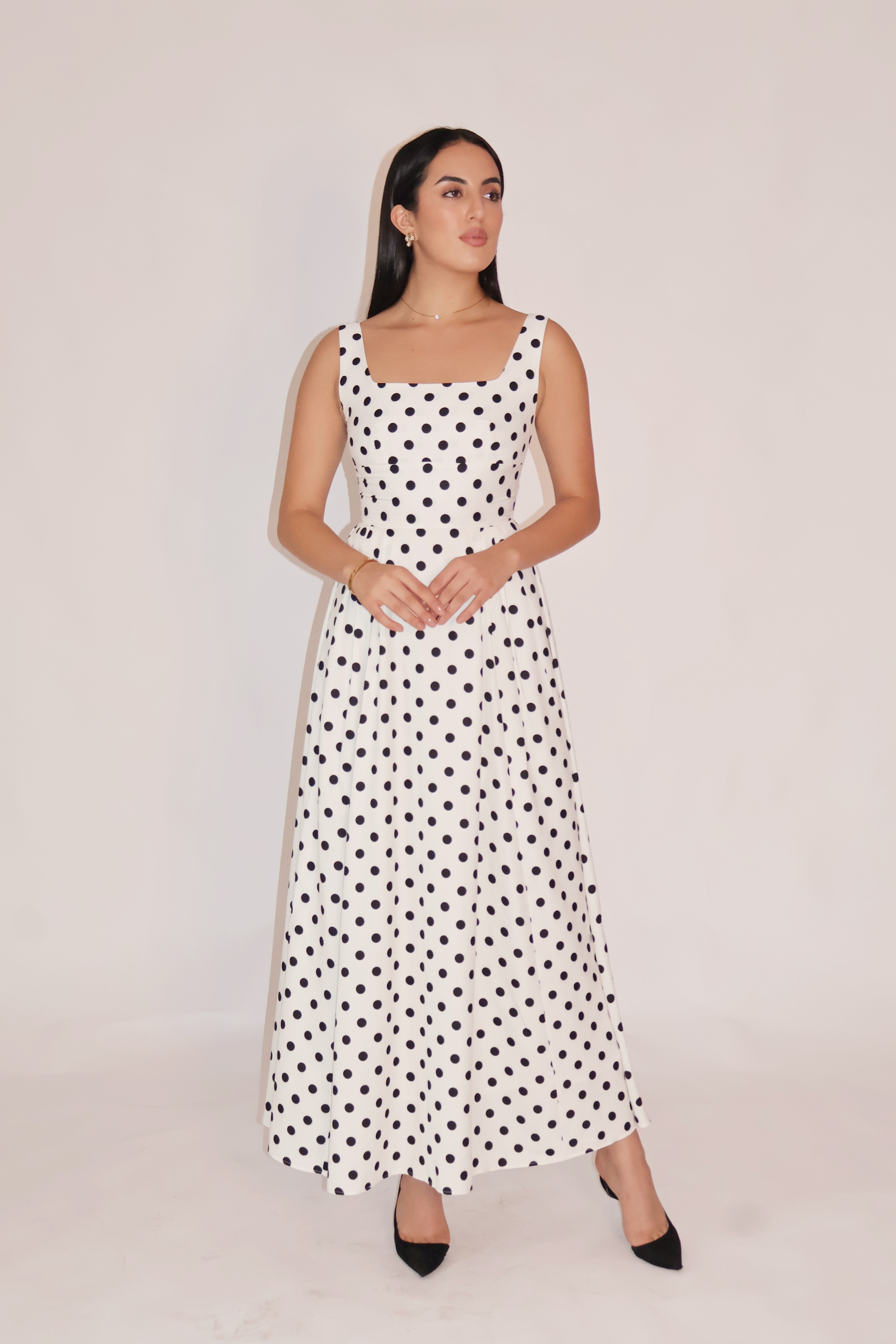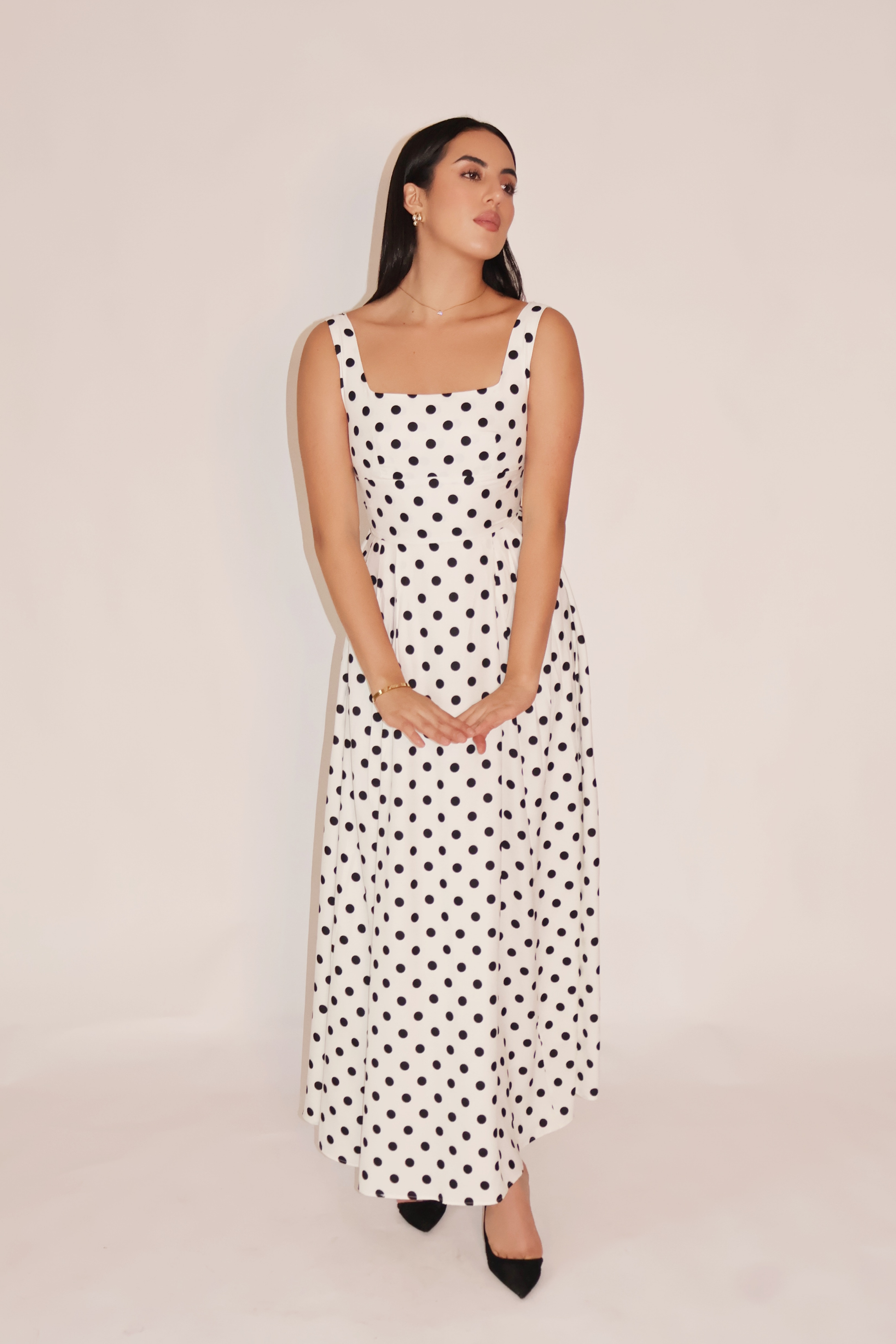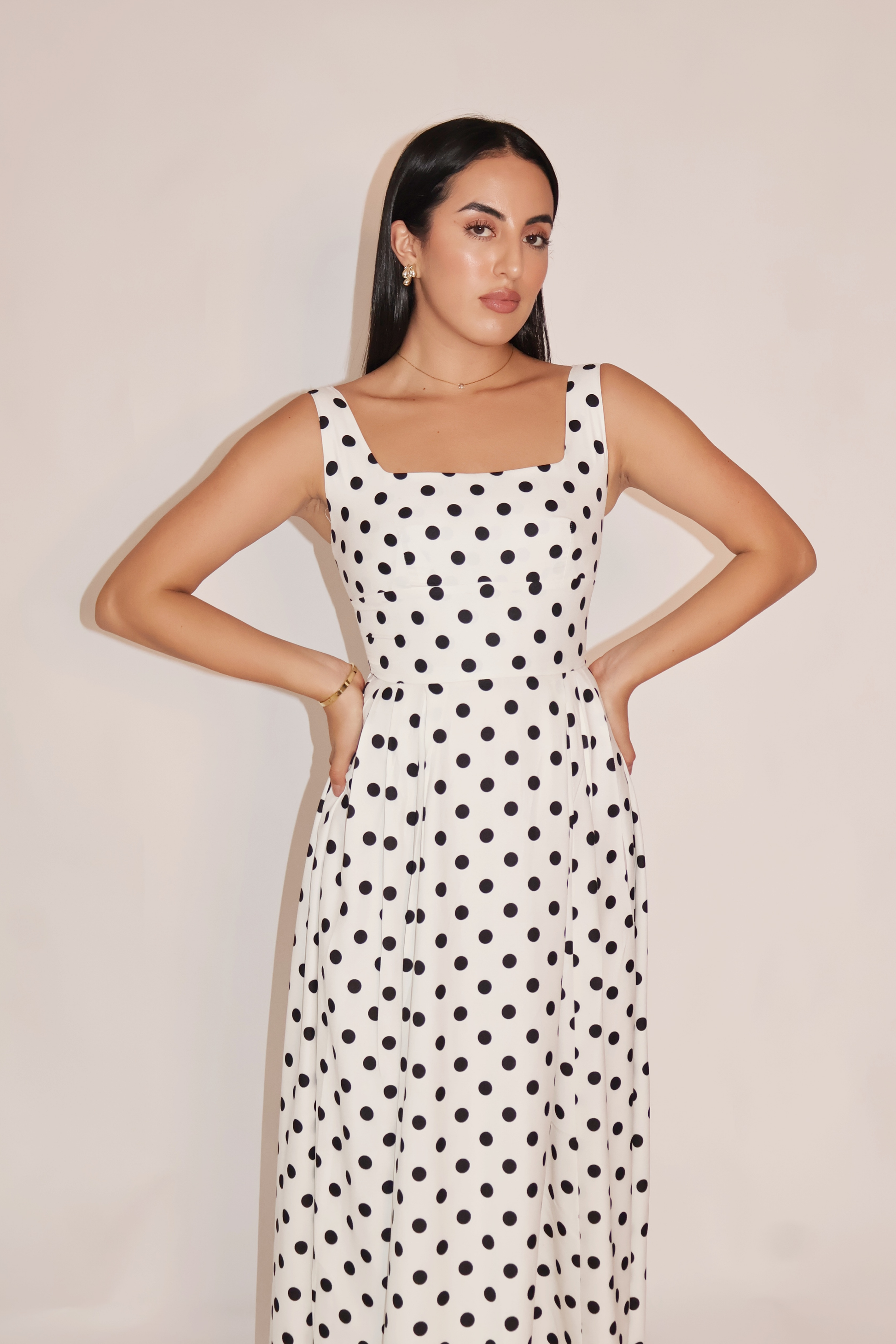 The DARLA Dress is defined by a sharp square neckline and a structured bust with a cinched waist that flows into an exaggerated pleated A-line silhouette. Feminine yet strong, this dress is cut to flatter with its seamless finish and clean back zipper. Made in premium imported georgette crepe, fully lined, and finished to perfection, it’s the ultimate occasion piece that feels rich, refined, and versatile. The model is wearing size S. Delivery within 3–15 business days.