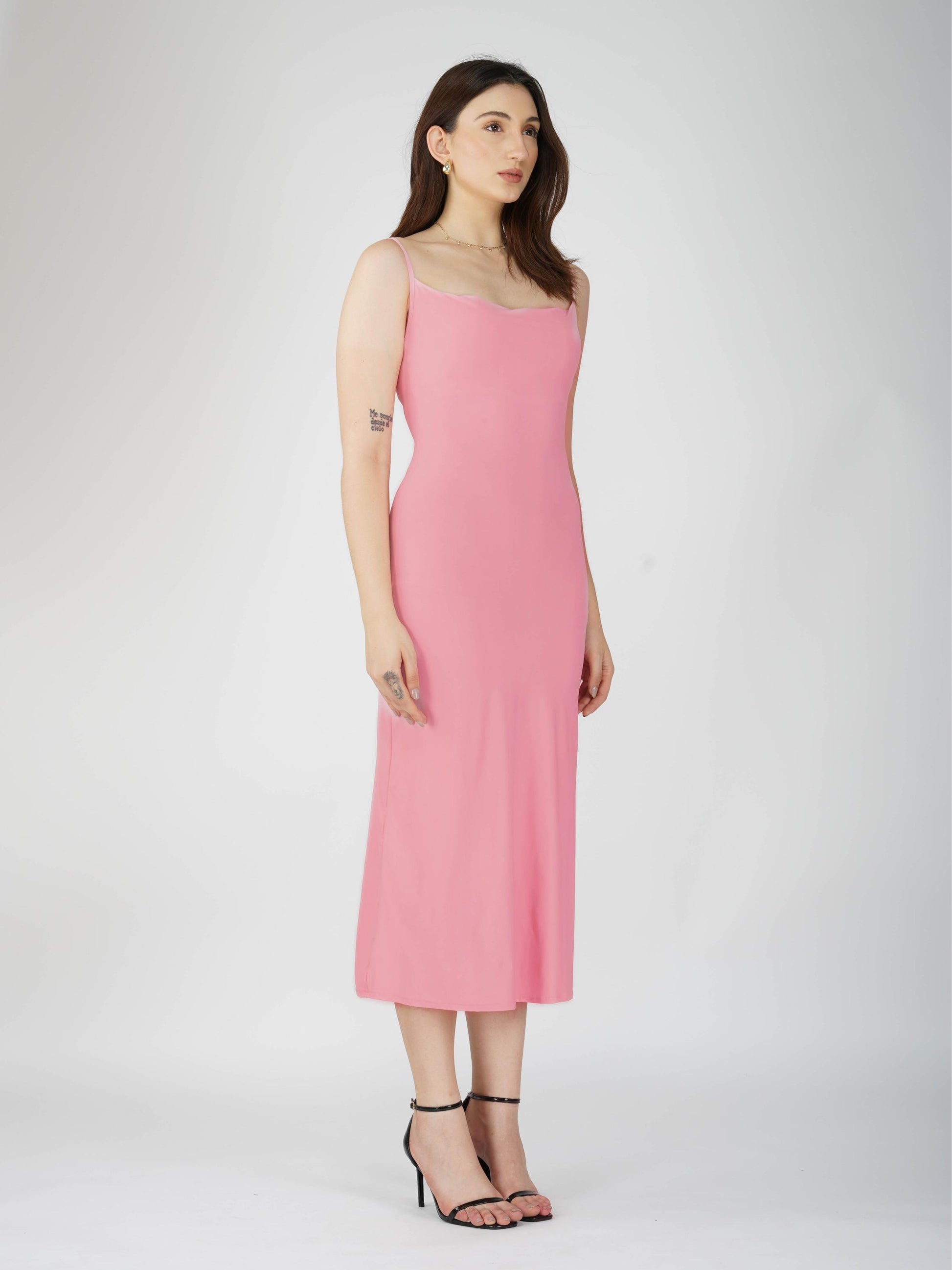 Slip into elegance with the Glow Dress in Flamingo. This classic cowl neck dress in playful flamingo pink features a soft draped neckline and a figure-skimming silhouette that moves beautifully with you. Perfect for evening occasions, date nights, or adding a luxe touch to your everyday edits.