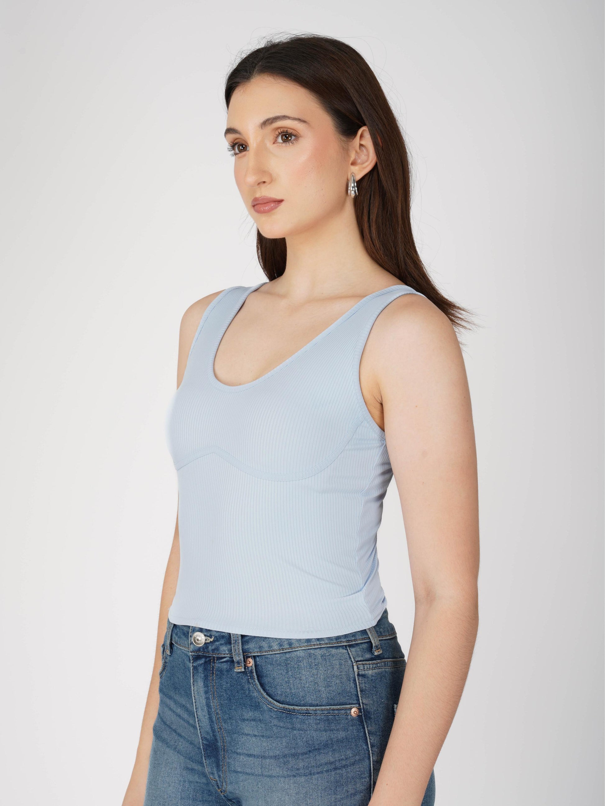 Cute meets sleek with the Nova Top in Sky. This cropped top in refreshing sky blue features an undercup detail that creates a seamless, sculpted look while offering a flattering fit. A perfect pick for styling with high-waisted pants, skirts, or layering under blazers.