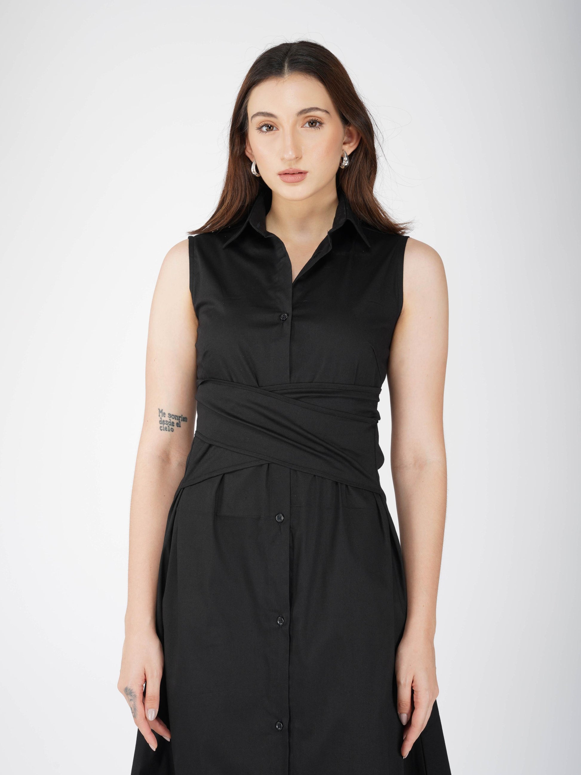 Polish your look with the Stone Dress in Onyx. This smart button-up midi dress in timeless onyx black features elegant long attached belt detailing to cinch the waist and create a flattering silhouette. A sophisticated choice for workdays, brunches, or stylish evenings out.