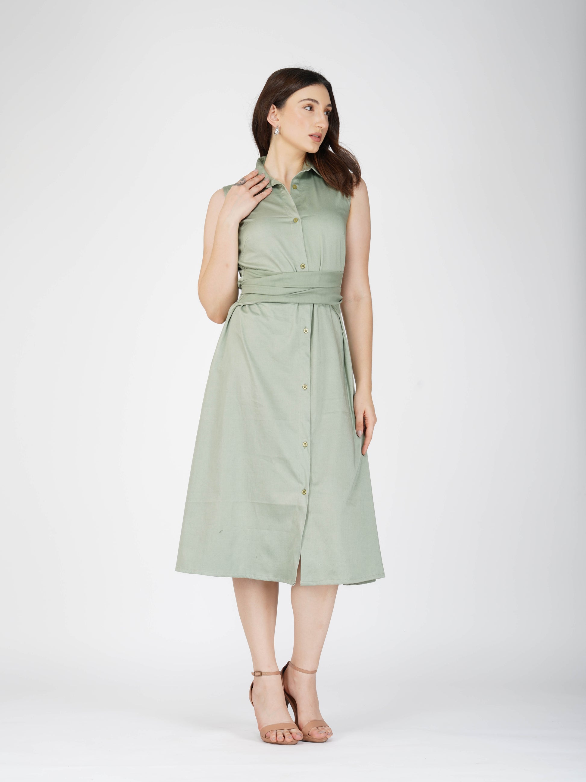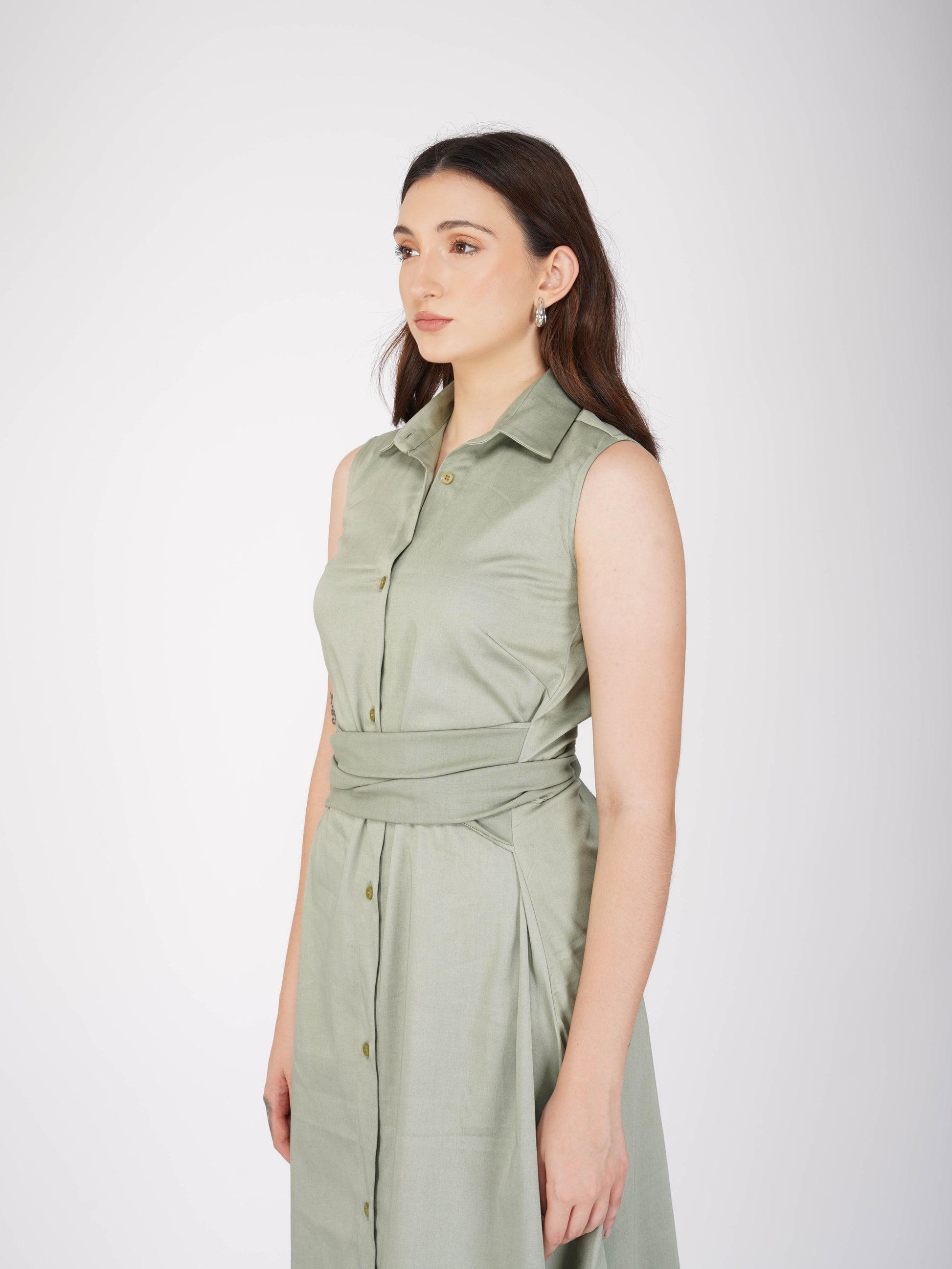 Polish your look with the Stone Dress in Sage. This smart button-up midi dress in refreshing sage green features elegant long attached belt detailing to cinch the waist and create a flattering silhouette. A sophisticated choice for workdays, brunches, or stylish evenings out.